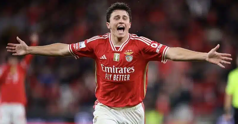 Aos 68 minutos João Neves inaugurou o marcador. Livre de Di María e o médio do Benfica, de costas para a baliza, penteia a bola, que ainda bate no poste antes de entrar.